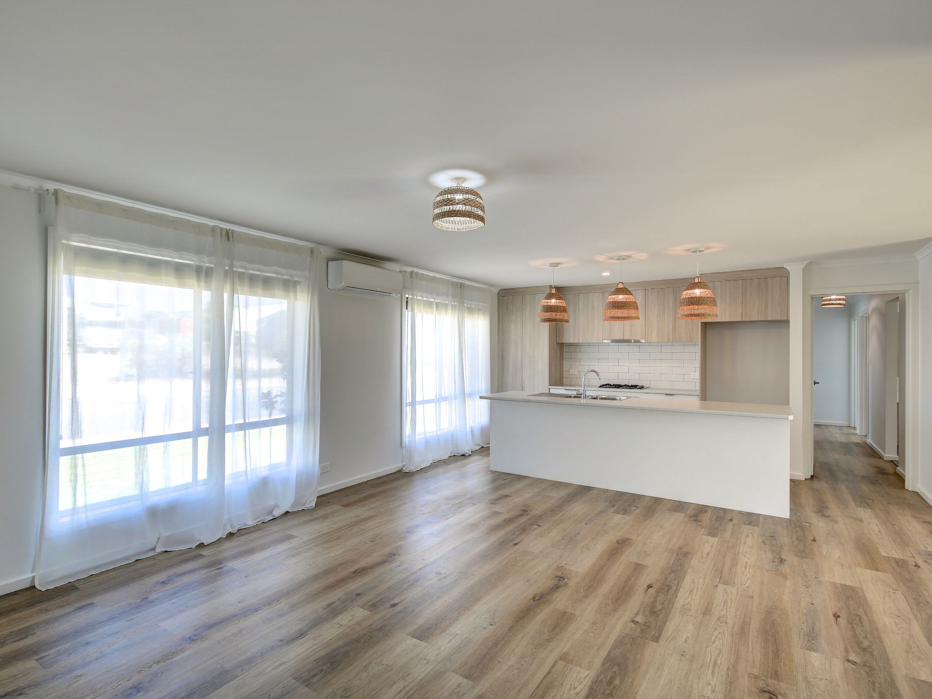 Open plan living at the rear with lots of natural light. Modern kitchen with ample cupboard space, breakfast bar, dishwasher and gas cooktop. Glass sliding doors that lead out onto the rear verandah/entertaining area. All year round comfort with split system heating in the main living area, second split system in the main bedroom and ceiling fans throughout.